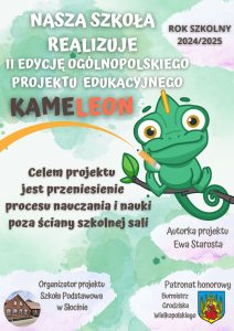 Projekt edukacyjny “Kameleon” to inspiracja do prowadzenia zajęć na świeżym powietrzu. Dzieciom będzie towarzyszył Kameleon, który wraz z uczniami opuści szkolne mury i ławki na rzecz nauki na łonie natury.