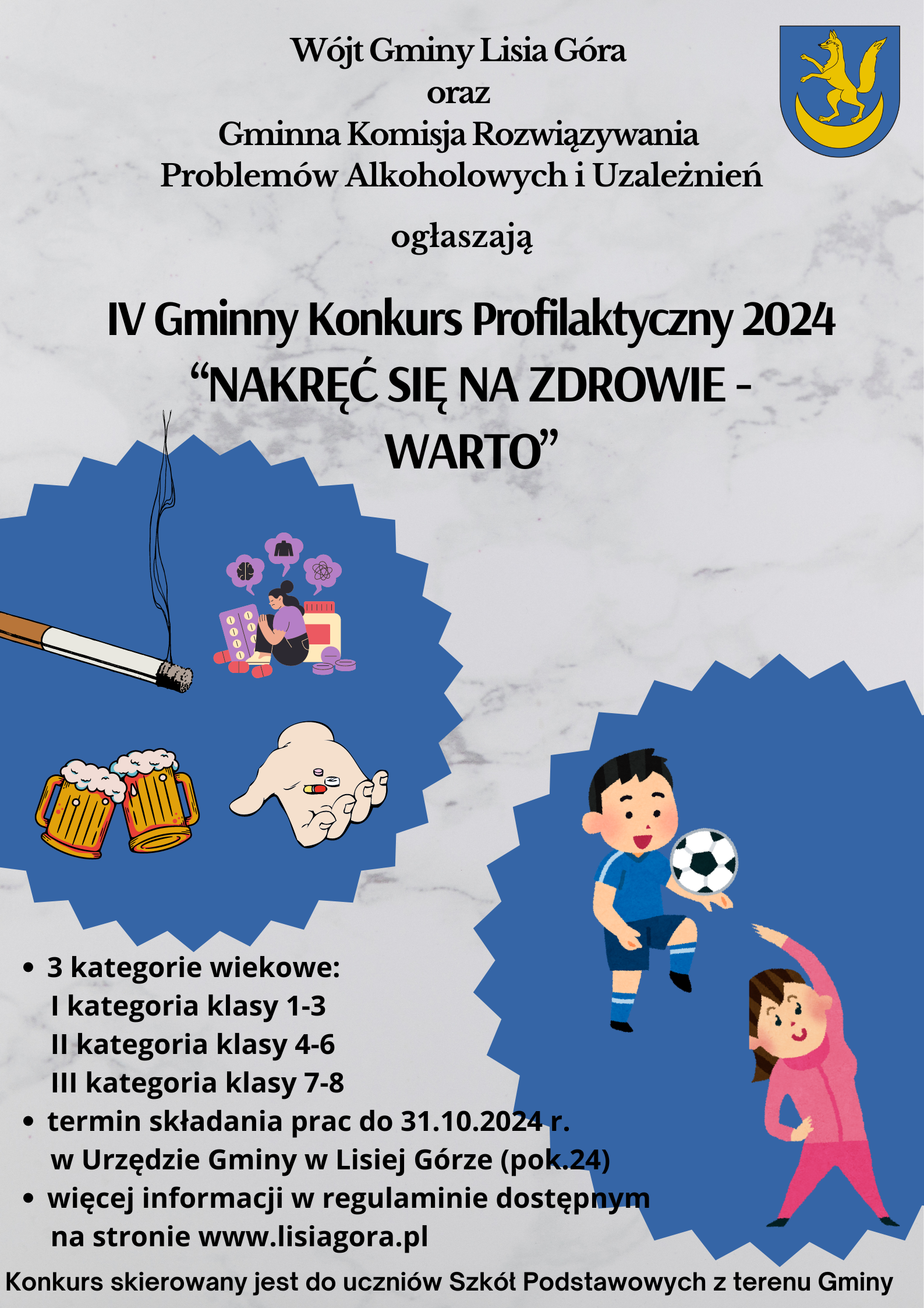 Wójt oraz Gminna Komisja Rozwiązywania Problemów Alkoholowych i Uzależnień Gminy Lisia Góra zaprasza na IV Gminny Konkurs Profilaktyczny 2024 „Nakręć się na zdrowie – Warto” dla uczniów Szkół Podstawowych z terenu Gminy Lisia Góra.
